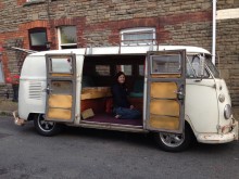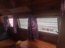 Being a sundial conversion, the interior is completely panelled out with marine ply, giving it that cool sauna look! In the rear there is a camping interior made by Nat and I with a full width rock and roll bed, and a seat/ cupboard unit with built in storage. There is even a multiple plug sockets and a hidden microwave which can be used via the 240v hook up I have installed. The floor has been carpeted (with the carpet left over from our bedroom!) and curtains are fitted throughout (sewing done by Nat!).