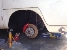 The van is lowered front and back. A 4” narrowed and adjustable front beam is fitted up the front, with lowered king and link pin axles, Porsche 944 brake disk and callipers. The rear of the bus is lowered with adjustable spring plates (As well as through the fitment of a type 1 gearbox). Standard beetle drum brakes are currently being used at the back but will be uprated soon.